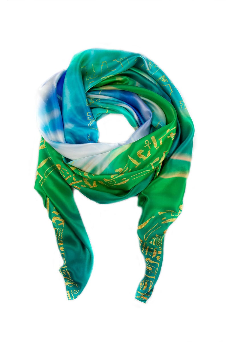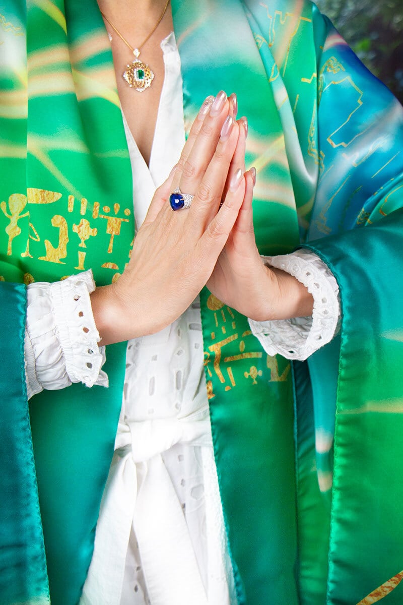 エメラルド・タブレットのスカーフは、神聖なコードと聖なる意図が注がれた聖なる鏡です。エメラルドグリーン、ゴールド、サファイアブルーの深い色合いが神聖なコードと融合し、啓示のマントを織り成しています。