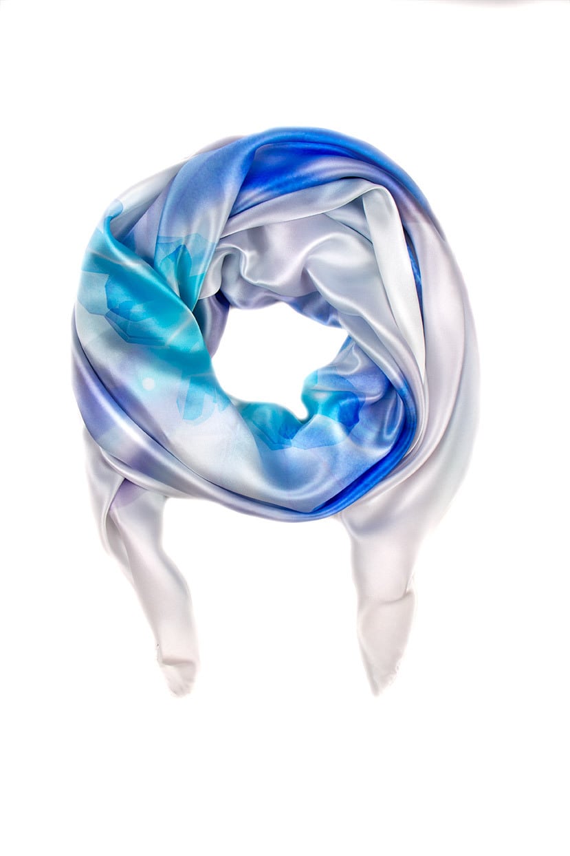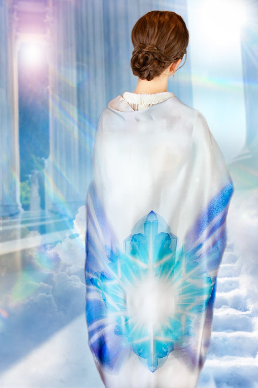 シャスタ山の聖水と祈りによって祝福されたこの神聖なスカーフは、宇宙の青い光を宿す天使のベールとなり、ハートの癒し、霊的な調和、そして新しい地球の意識の具現化をサポートします。