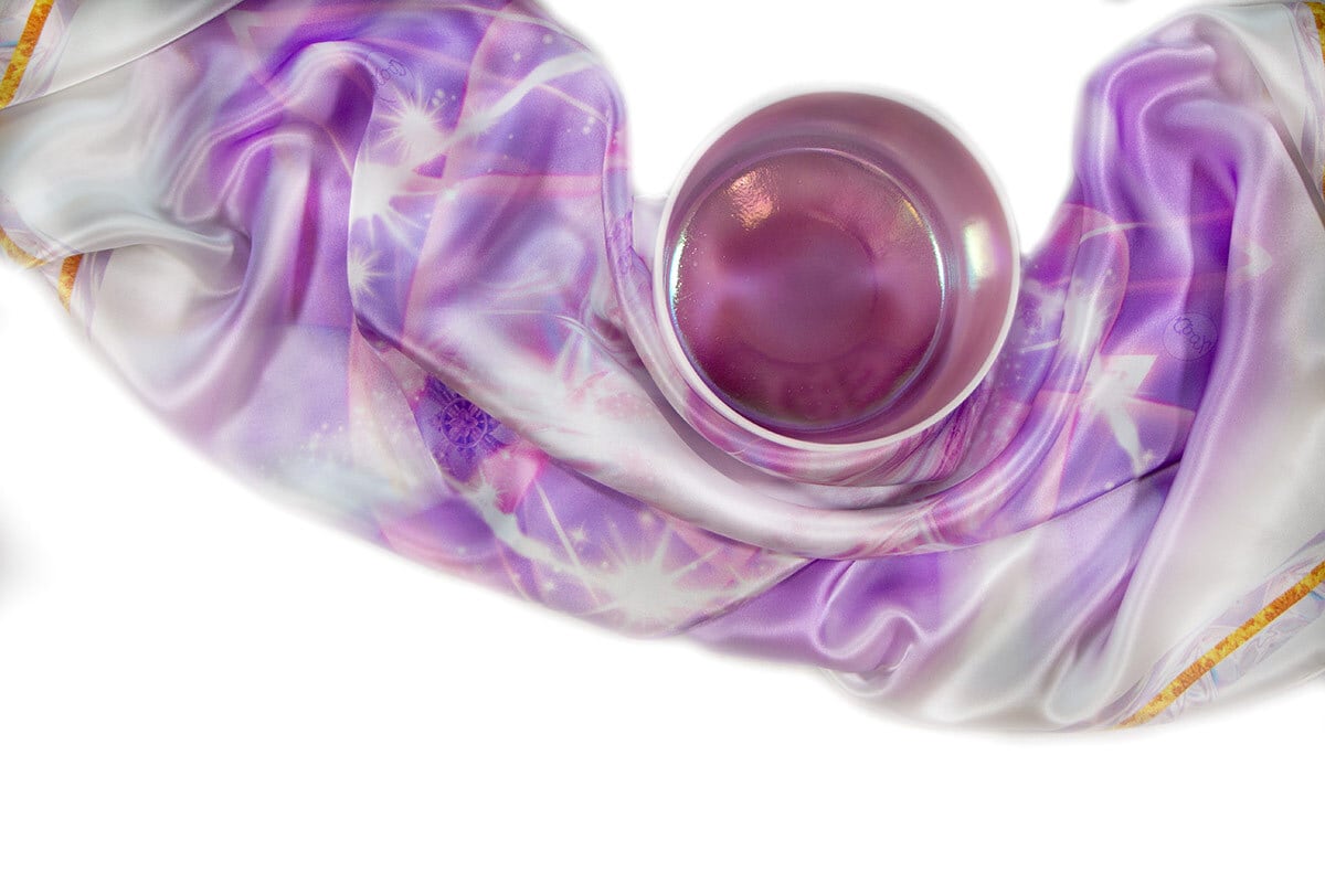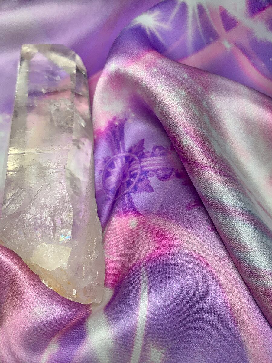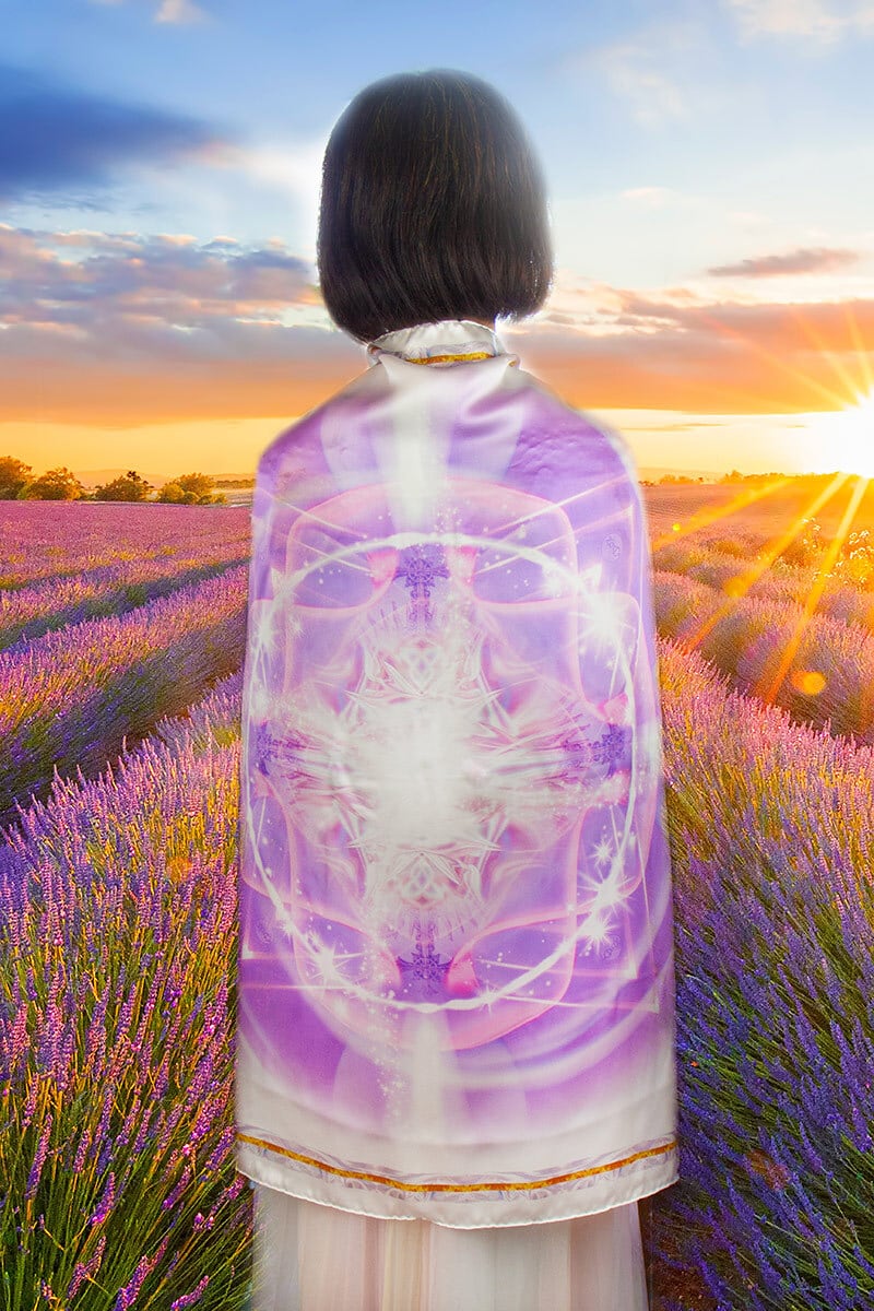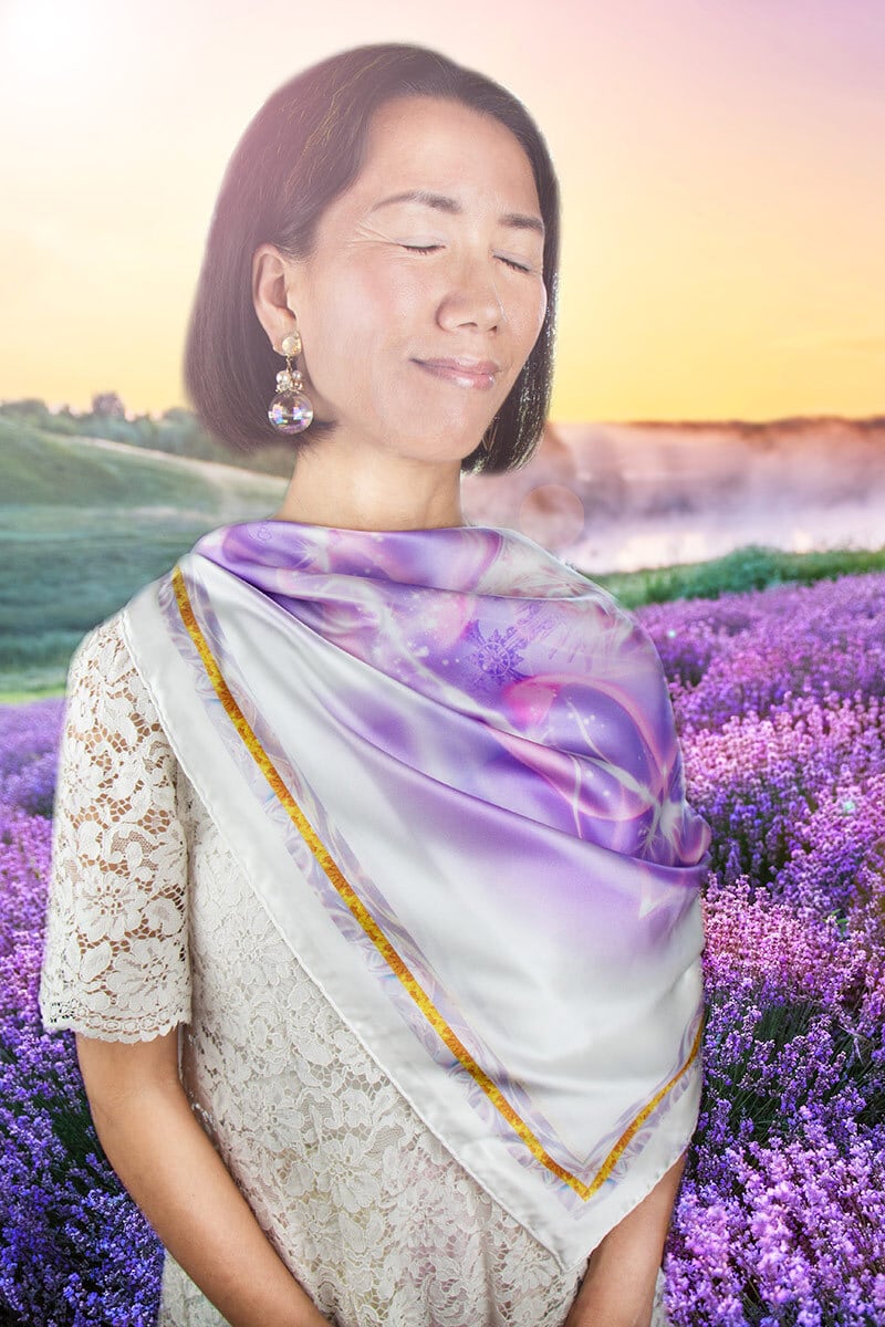 神聖なエネルギー、純白と柔らかなラベンダーの色調、そして私たちの真摯な祈りの完璧な融合が、スカーフのエネルギーマトリックスを目覚めさせます。このスカーフが、神聖な共同創造と女神のミステリースクールの高次の創造エネルギーとつながるための、あなただけのお守りとなりますように。